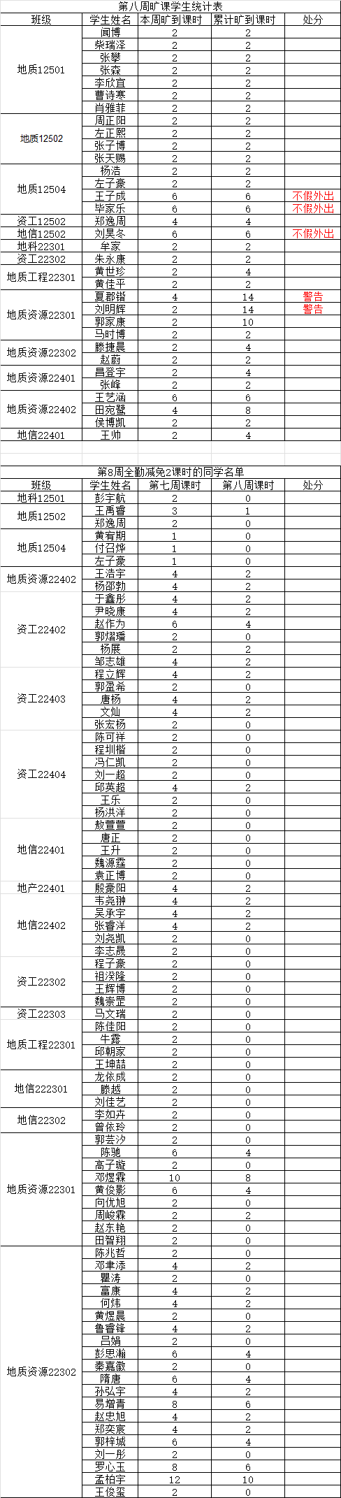 关于第八周课堂考勤的通报 为落实学院关于加强学风建设的相关要求,进一步规范课堂秩序,营造良好的学习氛围,我院持续开展常态化课堂考勤工作。现将第八周考勤情况通报如下: 一、旷课学生名单 二、相关说明 依据《积极分子动态管理办法》第五章,积极分子考察期内无故旷课取消身份。 依据《威廉williamhill学生违纪处分办法》,一学期累计旷课达到规定学时的,分别给予以下处分: 1. 旷课达到12学时,给予警告处分; 2. 旷课达到24学时,给予严重警告处分; 3. 旷课达到36学时,给予留校察看处分; 4. 旷课达到48学时,给予留校察看处分; 5. 旷课达到60学时,给予开除学籍处分。 注:若学生某周存在旷课记录,但次周所有课程均正常到课(无迟到、旷课),则可从该生累计旷课课时中减免 2学时。