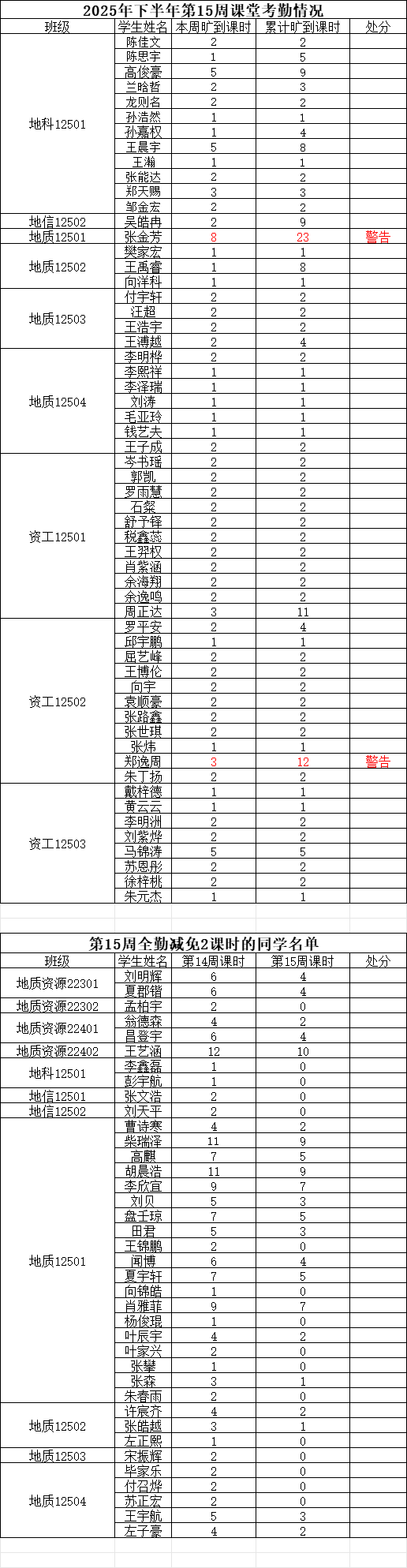 为落实学院关于加强学风建设的相关要求,进一步规范课堂秩序,营造良好的学习氛围,我院持续开展常态化课堂考勤工作。现将第十五周考勤情况通报如下: