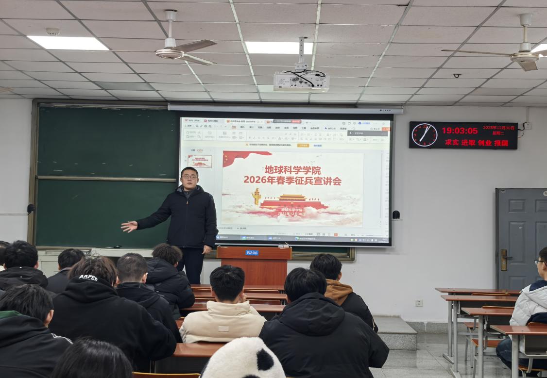 (通讯员 黄瑱 邢佰诗 李雨泽/摄)为深入贯彻落实国家征兵政策,激发在校大学生携笔从戎、报效祖国的热情。12月30日晚19:00,地科学院2026年春季征兵宣讲会在武教B206以线上线下融合方式举行。会议由退伍士兵地信22401班彭郝毅、资工22304班郑杰担任主讲,辅导员乔宇、黄瑱于武汉和荆州校区同步主持,400余名学生参与活动。