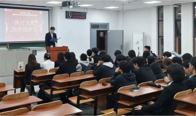 随后,学生会执行主席张奕扬围绕“倾听、行动、共创”三大主题,阐述了新一届学生会的工作规划。他提出,未来工作将重点聚焦于两校区同学的普遍诉求、推动务实服务有效落地,并积极搭建跨校区共同参与的互动平台,致力于将学生会建设成为连接学院与同学的坚实桥梁与温暖纽带。