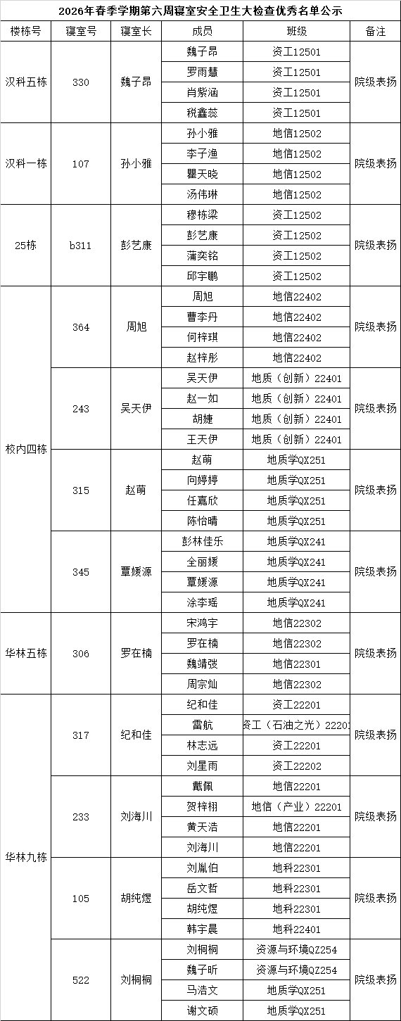 关于2025-2026学年第二学期第6周寝室安全卫生大检查情况的通报