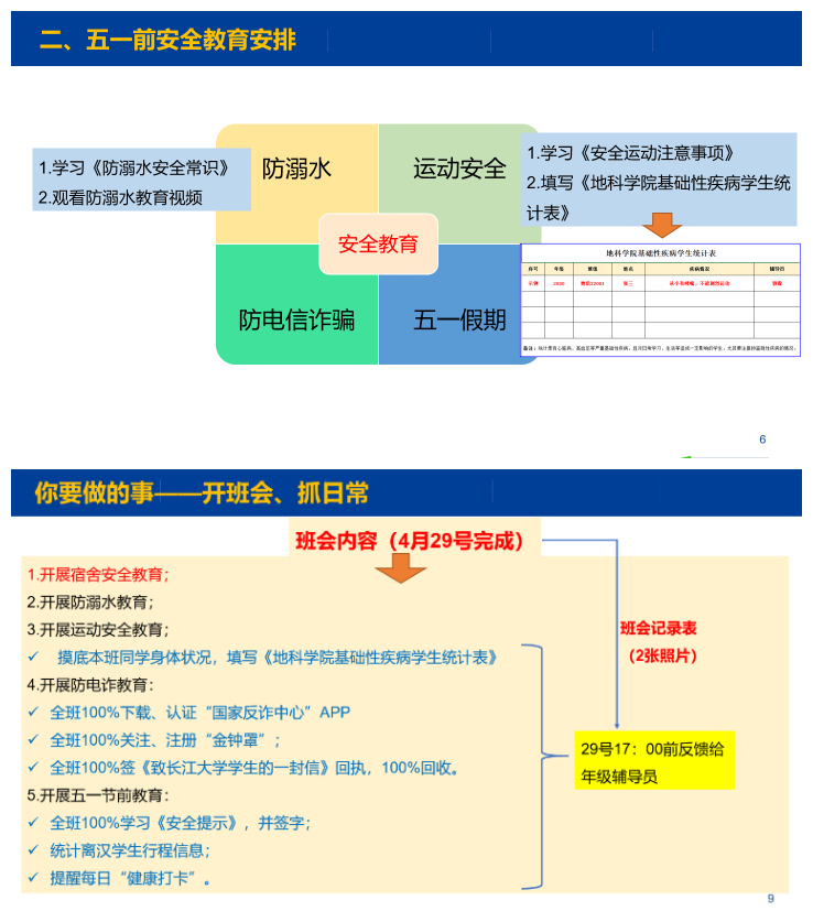 接下来,郭霖老师针对一系列安全问题做了详细安排和说明。一是宿舍管理方面。郭老师通报了4月份我院学生宿舍使用违规电器和晚归情况,并对事件危害进行了分析,提醒大家务必遵守学校相关规定,安全高于一切。二是五一假期安全。要求各班班长召开安全主题班会,在班会上做好防溺水、运动安全、防电信诈骗和五一假期安全四个方面的教育,重点做好“国家反诈中心”APP和微信公众号“金钟罩”的下载与认证、假期离汉学生的行程登记、假期安全教育告知书的签收等。