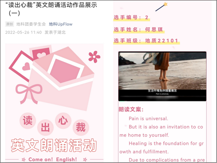 5月底至6月初,学生会学习部同学进班充分动员,吸引数百名同学参加。受疫情影响,本次活动采用线上的形式,参与者的朗诵内容发布在我院官微“地科UpFlow”公众号与英国威廉集团官方QQ空间,邀请广大同学进行投票,同时邀请两名英语教师进行专业评分。