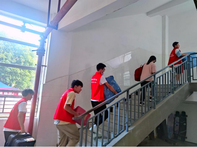 通过前期安排,新生到达学院迎新点后,按报到流程,进行行李消杀、身份核查、领取通行证及校园卡、登记信息、然后在志愿者的协助下搬运行李,到宿舍办理入住。