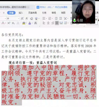 (通讯员 徐艳霞)4月10日下午4时,我院机关党支部利用腾讯会议网上平台开展了4月政治理论学习与支部主题党日活动。活动由机关党支部书记马丽主持。