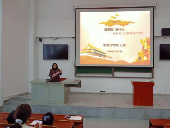 任倩老师首先以《讲奉献勇作为——做新时代合格共产党员》作为党课主题,为大家讲解了新时代党员的责任与义务,让大家对照标准找差距,主动学习,提升自已。随后,任老师向大家生动讲述了疫情期间我院抗疫志愿者向栩、吴金铭等同学勇敢抗疫的故事和今年6月份毕业生返校志愿者的无私奉献、乐于助人、默默奉献的事迹,称赞他们也是“最美逆行者”,真正起到了先锋模范带头作用。最后,她呼吁大家向身边的榜样学习,思想与行动上都要积极向党组织靠拢,以不怕困难、勇担使命的实际行动展示地科学子风采。