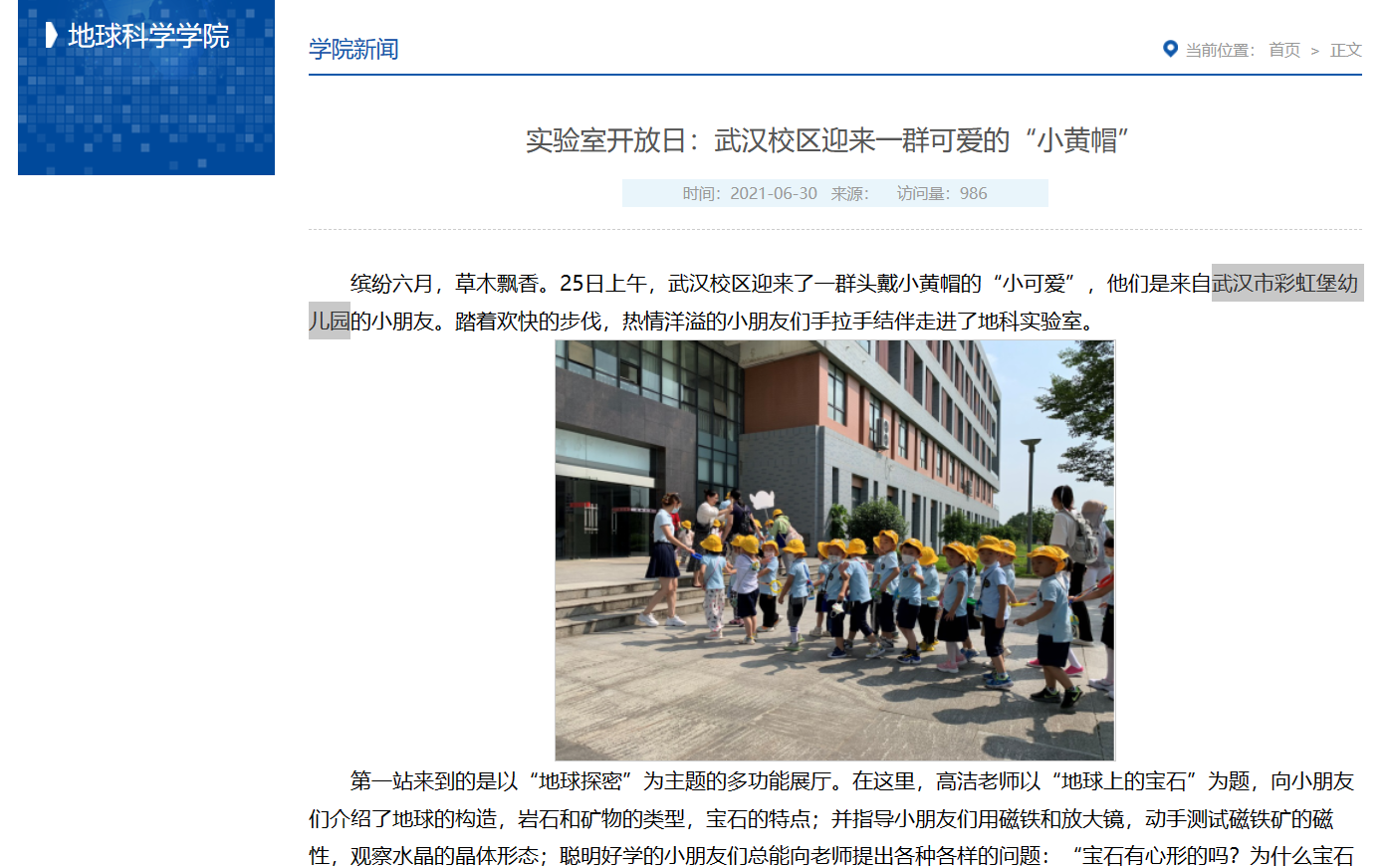 同时,基地结合英国威廉集团主页宣传工作,围绕与科普基地相关的各类活动开展了大量同步的在线宣传报道工作(图57-图59)。例如,面向社会公众开放的“实验室开放日”活动,面向全校大学生开展的“地学实践竞赛”活动,面向蔡甸姚家林小学开展的大学生支教活动等。这些宣传报道将科普基地广泛地推荐给社会公众,起到了良好的辐射效应。