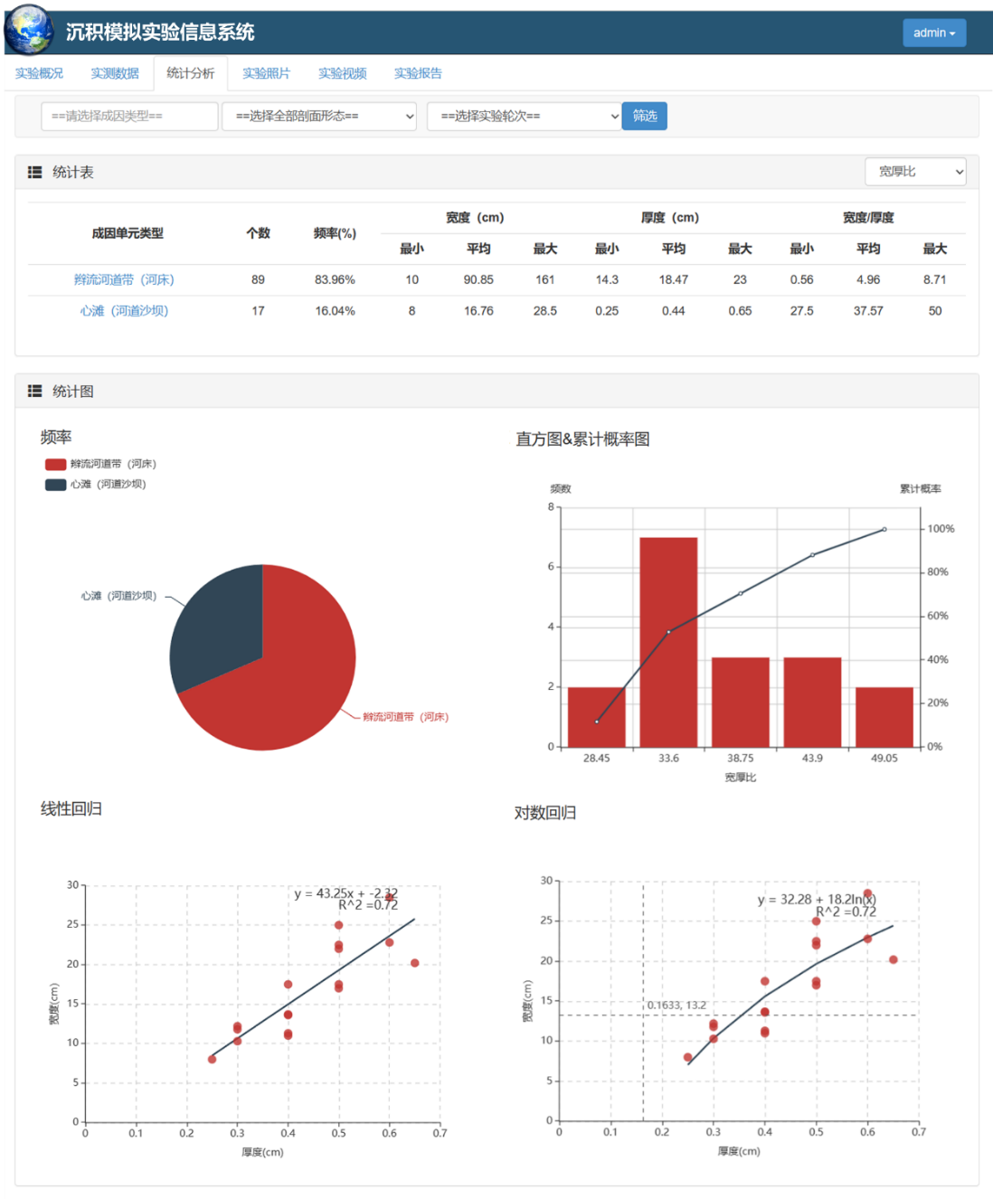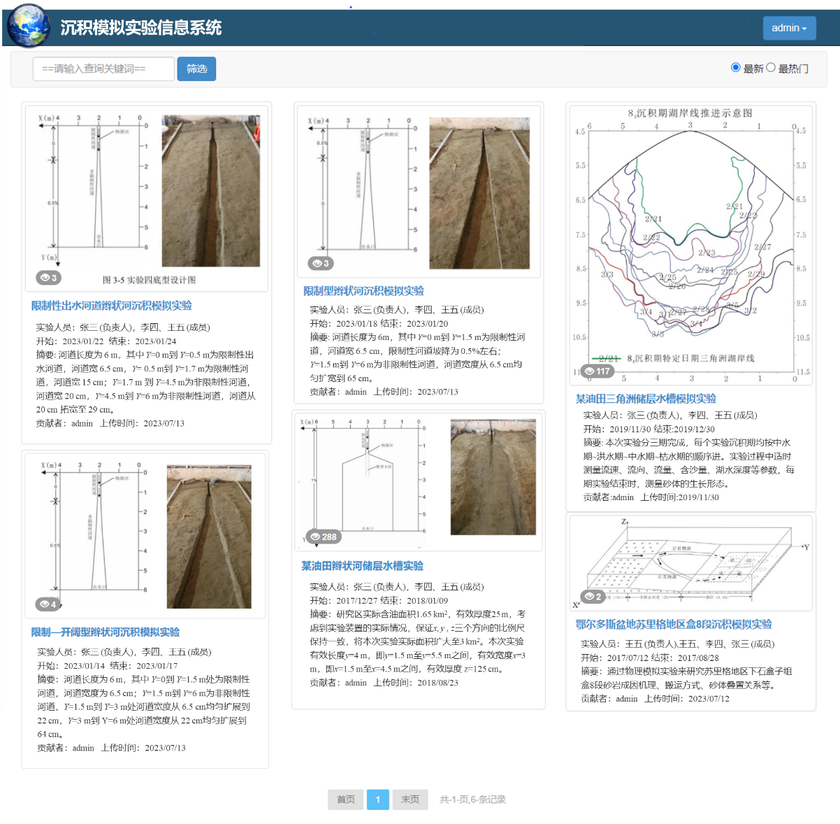 面向湖泊沉积模拟实验大量实验数据资料的管理、分享和分析需求,提出B/S模式的沉积模拟实验信息系统(图54-图56),实现了沉积模拟实验的实验设计方案、实验观测数据、实验结果等信息的集成管理、高效检索和可视化分析等功能,从而为沉积模拟实验的网上信息化管理与分析应用提供可行方案。实验管理人员和大众可通过系统轻松完成实验项目检索、实验详情浏览、砂体测量数据的统计分析等工作。