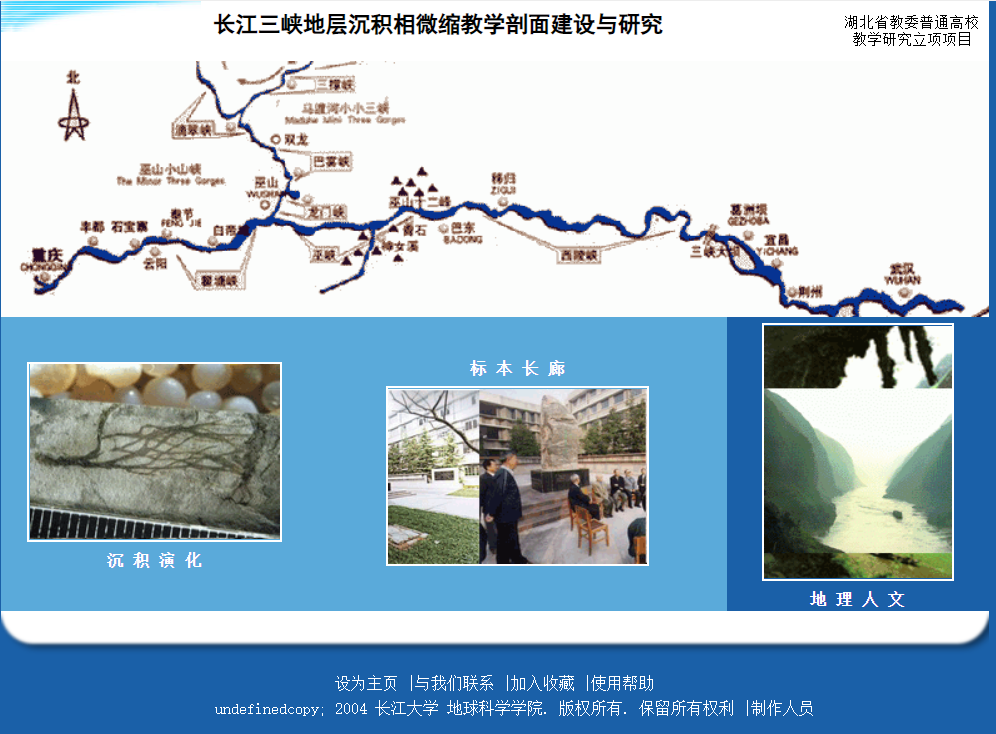 自20世纪初以来,三峡地区就已成为我国地质学家开展地层学、古生物学、沉积学等多种学科研究的重要场所;它同时也是威廉williamhill地球科学院系沿用多年的地层学、沉积学野外实习基地和开展过多项科研项目的区域,目前已积累了大量地质资料和研究成果。为将这些丰富的资料和成果转化为教学资源,抢救性地保护三峡地质资源,在中国石油天然气集团公司的资助下,设立了《长江三峡剖面微缩工程》项目,在威廉williamhill校园内建立了三峡地层标本长廊(图52)校内实习基地。为了将其该项目公众宣传,同时为了保证了地层标本的连续性和完整性,弥补了长廊标本的密度有限、且难以陈列易风化破碎的标本等问题,我们采用Flash动画技术制作了三峡长廊的动画视频集成了每一块标本的高清照片,公众可通过网站(图53)在线观察地质长廊的标本照片及其文字描述,学习相关地质知识。