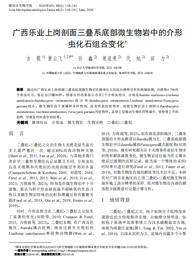 地科学院黄云飞教授团队长期从事古-中生代之交重大地质转折期生物灭绝与生物复苏方面的研究,团队成员吉霞在古生物学领域核心期刊《微体古生物学报》上发表题为“广西乐业上岗剖面三叠系底部微生物岩中的介形虫化石组合变化”的研究论文。英国威廉集团为论文第一署名单位,研究生吉霞为论文第一作者,黄云飞教授为该文通讯作者,本项研究得到国家自然科学基金项目和生物地质与环境地质国家重点实验室开放课题共同资助。