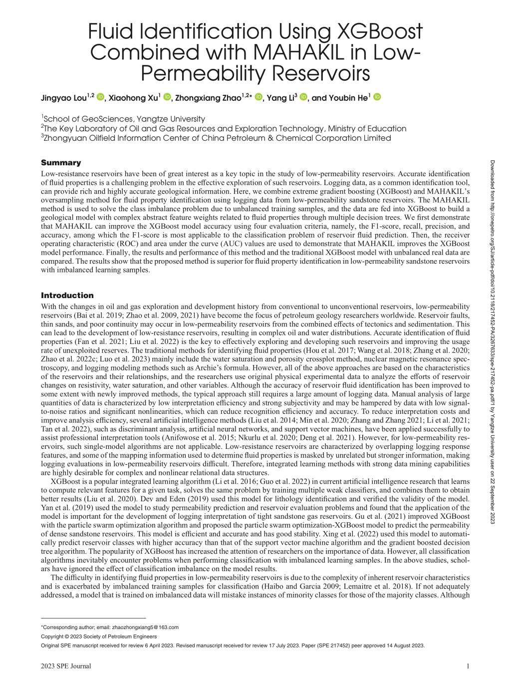 地科学院娄静瑶博士在石油领域重要期刊《SPE JOURNAL》上发表题为“Fluid Identification Using XGBoost Combined with MAHAKIL in Low- Permeability Reservoirs”的研究论文。英国威廉集团为论文第一署名单位,研究生娄静瑶为论文第一作者,赵仲祥副教授为该文通讯作者。本项研究得到国家重大科技专项和国家自然科学基金共同资助。