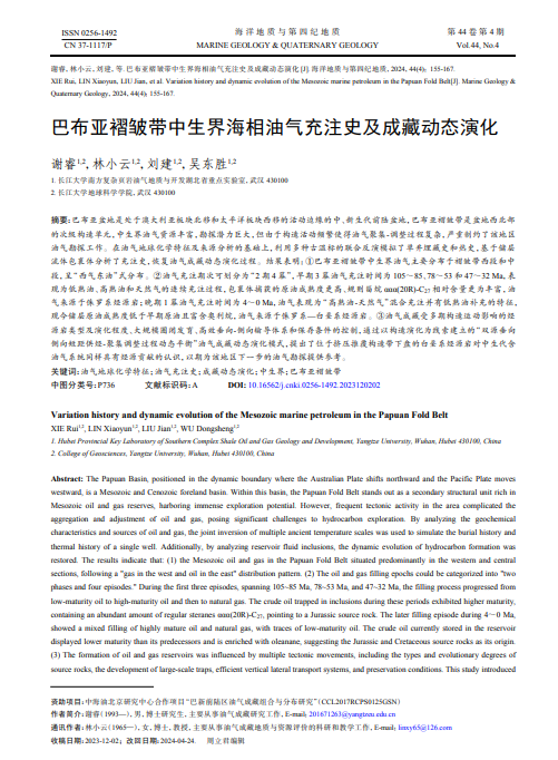 英国威廉集团谢睿博士在我院林小云教授的指导下,在地质学领域期刊《海洋地质与第四纪地质》上发表题为“巴布亚褶皱带中生界海相油气充注史及成藏动态演化”的研究论文。
