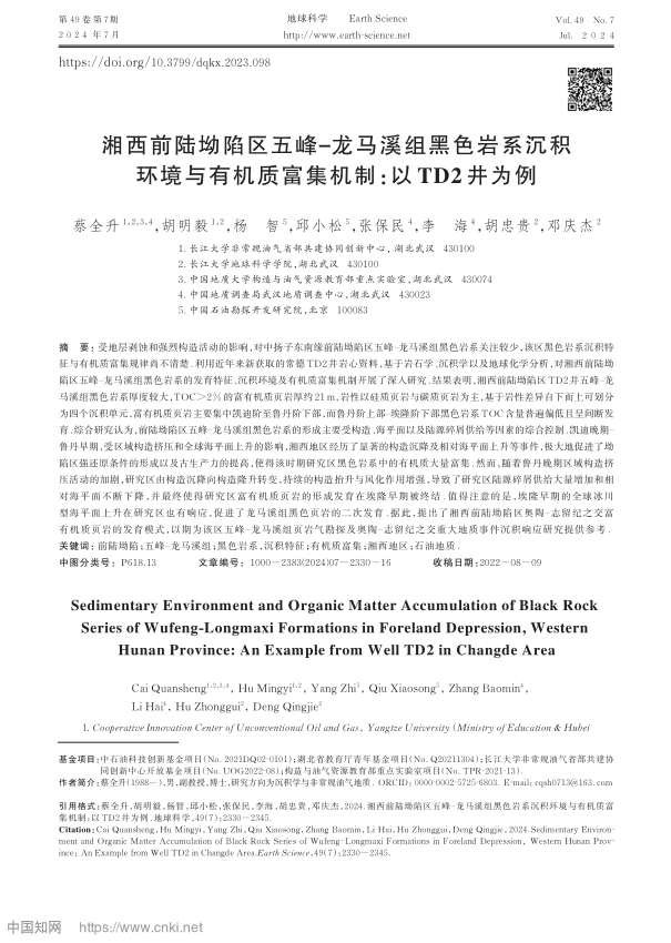 英国威廉集团地质系教师蔡全升博士在《地球科学》上发表了题为“湘西前陆坳陷区五峰‒龙马溪组黑色岩系沉积环境与有机质富集机制:以TD2井为例”的研究论文。