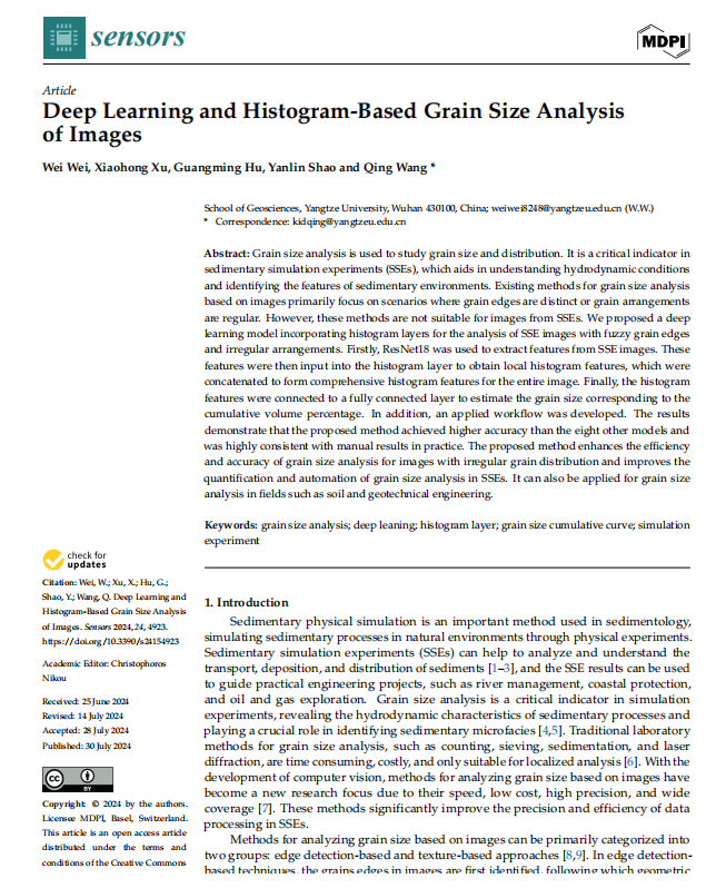 我院魏薇博士在国际学术期刊《Sensors》上发表了题为“Deep Learning and Histogram-Based Grain Size Analysis of Images”的SCI论文,提出了一种创新的基于深度学习和直方图分析的图像粒度识别方法。该研究不仅在理论上具有创新性,而且在实际应用中展现了显著的效率与准确性,为沉积模拟实验中的粒度分析提供了新的技术路径。