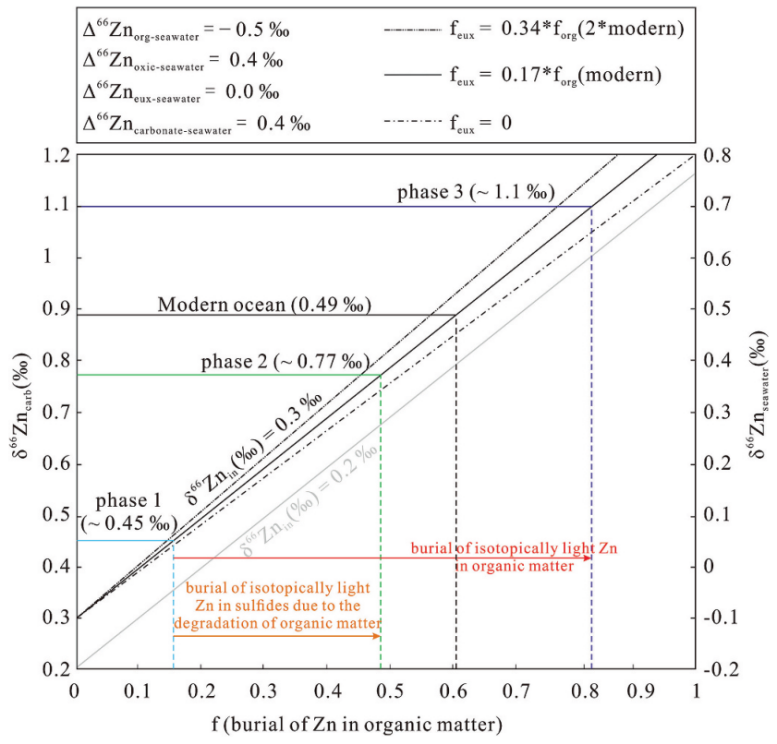 该研究选取华南扬子地区下志留统布拖组为研究对象,利用同位素地球化学、元素地区化学等方法,探究早志留世时期全球古气候条件、海洋水化学条件、生物演化之间的相关关系及其对烃源岩有机碳保存的控制机制。结果显示,随着赫南特冰期的结束,海洋锌(Zn)同位素组成展现出显著的负漂现象,指示全球大陆风化作用的增强(图1);随后锌同位素组成在赫南特晚期展现出升高的趋势(升高~0.4‰,图1),并伴随着碳同位素的降低和海洋水体硫化,指示全球硫化缺氧面积的扩大和硫化物埋藏量的增大;鲁丹期海洋锌同位素组成展现出显著的正漂移现象(升高~ 1.1‰,图1),并伴随着碳同位素的升高和海洋水体的缺氧,指示鲁丹期全球有机质埋藏量的显著升高(定量模型计算表明升高~6倍初始阶段,图2)。