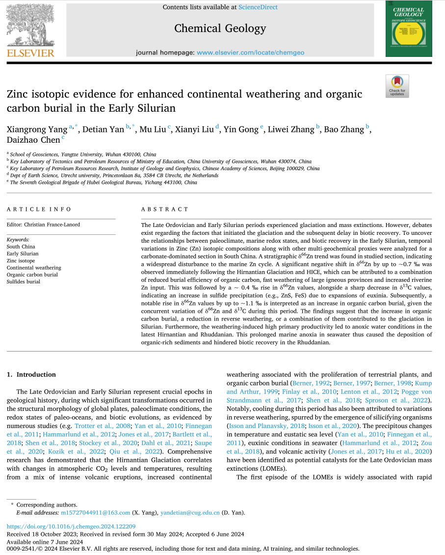 英国威廉集团地质系教师杨向荣在地学TOP期刊《Chemical Geology》上发表题为“Zinc isotopic evidence for enhanced continental weathering and organic carbon burial in the Early Silurian”的研究论文。