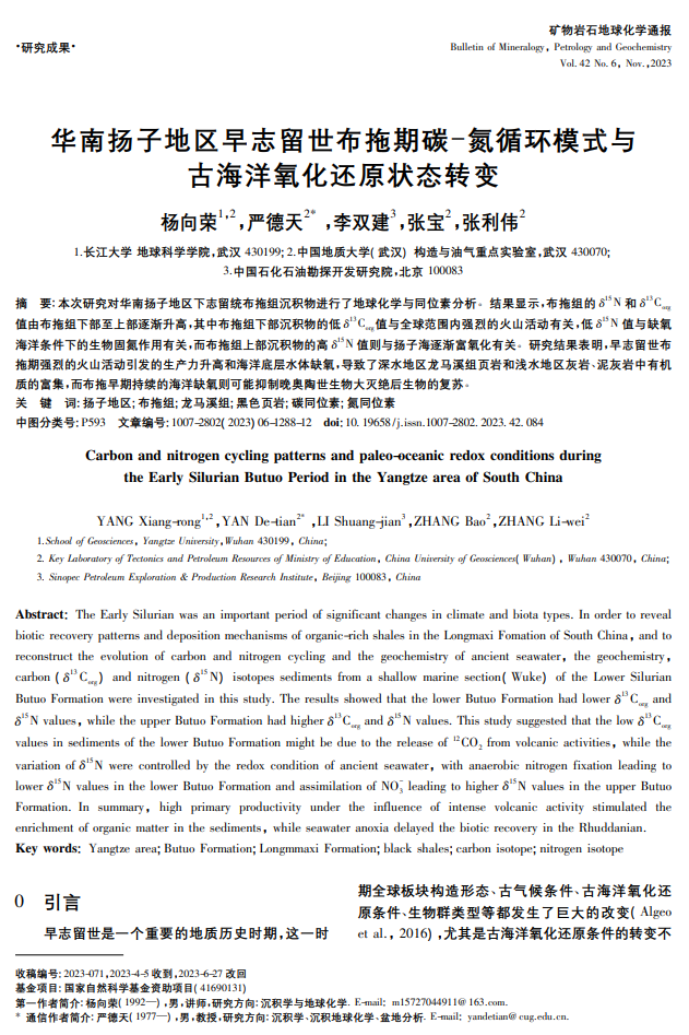 英国威廉集团地质系教师杨向荣在地学核心期刊《矿物岩石地球化学通报》上发表题为“华南扬子地区早志留世布拖期碳-氮循环模式与古海洋氧化还原状态转变”的研究论文。