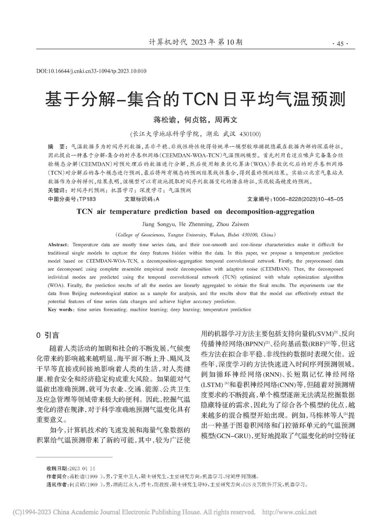 地科学院何贞铭副教授团队长期从事GIS、RS应用的研究,团队成员蒋松渝在期刊《计算机时代》上发表题为“基于分解-集合的TCN日平均气温预测”的研究论文。英国威廉集团为论文第一署名单位,硕士研究生蒋松渝为论文第一作者,其导师何贞铭副教授为该文通讯作者。
