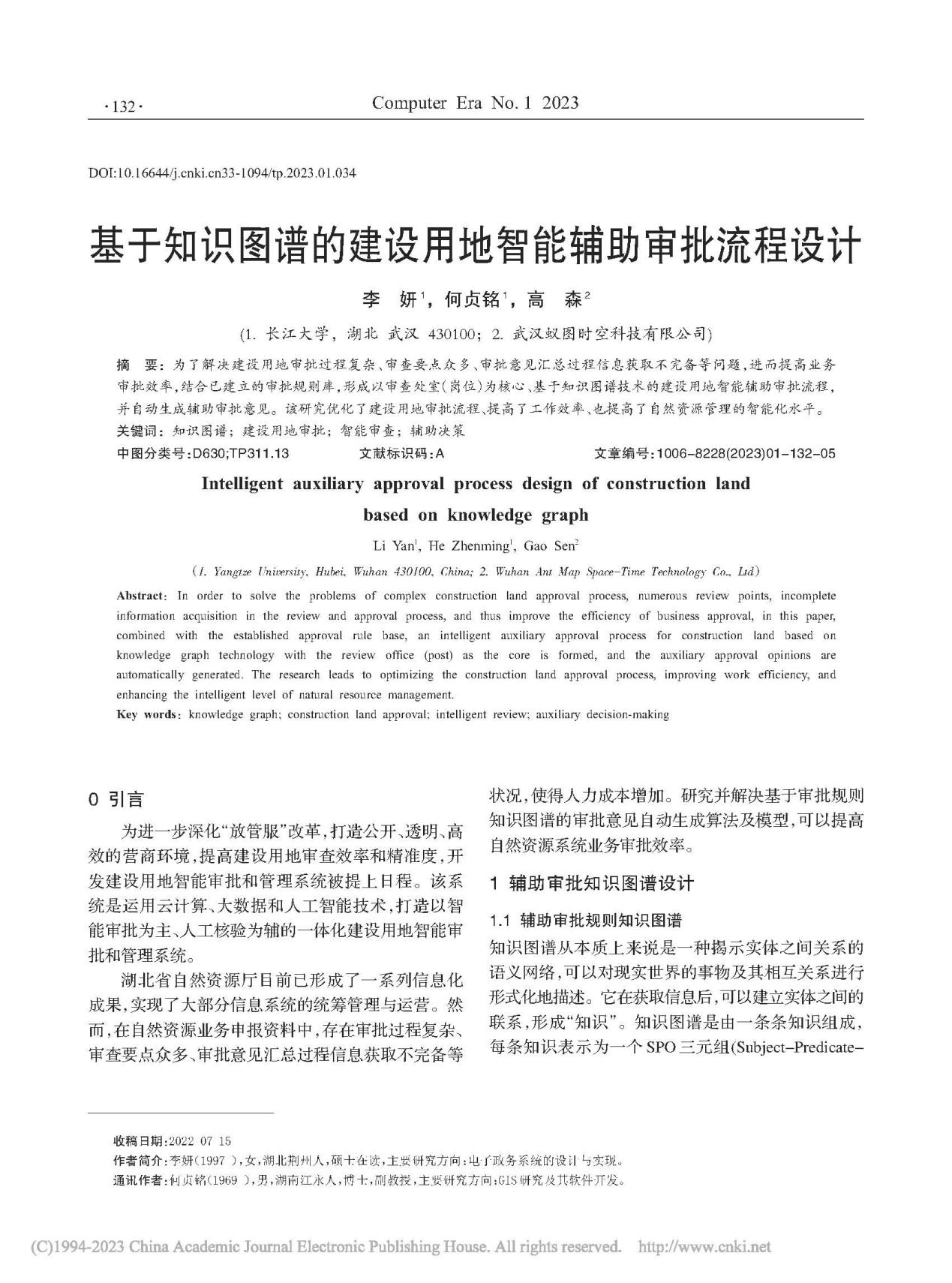 地科学院何贞铭副教授团队长期从事GIS、RS应用的研究,团队成员李妍在期刊《计算机时代》上发表题为“基于知识图谱的建设用地智能辅助审批流程设计”的研究论文。英国威廉集团为论文第一署名单位,硕士研究生李妍为论文第一作者,其导师何贞铭副教授为该文通讯作者。