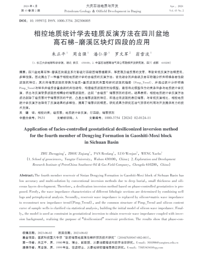 英国威廉集团地科系教师朱正平博士在石油地质学领域主流期刊《大庆石油与地质》上发表题为“相控地质统计学去硅质反演方法在四川盆地高石梯-磨溪区块灯四段的应用”的研究论文。