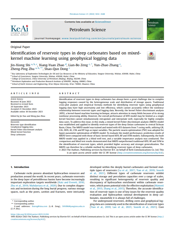 英国威廉集团石油系教师史今雄博士在石油领域重要期刊《Petroleum Science》上发表题为“Identification of reservoir types in deep carbonates based on mixed-kernel machine learning using geophysical logging data”的研究论文。本项研究得到了国家自然科学基金项目和湖北省自然科学基金项目的资助。