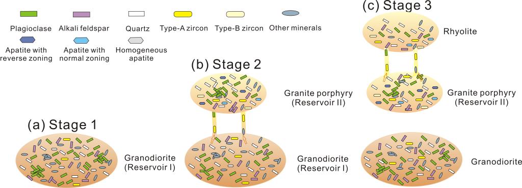 该项研究揭示,都兰三套不同的岩石单元(花岗闪长岩、花岗斑岩、流纹岩)在锆石U-Pb年龄、稀土元素模式和εHf(t)值表现出相似的特征,表明火山岩与侵入岩应该来自于同一深部的岩浆储库。花岗闪长岩-花岗斑岩-流纹岩的成分变化明显受到斜长石、磷灰石和部分镁铁矿物等分离结晶的控制。浅成-深成相侵入岩均具有与残余堆晶体类似的特征,火山岩代表了从晶粥储库中抽取出来的熔体成分。都兰地区火山-侵入杂岩的形成至少与两阶段晶体-熔体分离过程关系密切。其中,早期阶段发生在地壳约33km深度处,由于流体的注入促发了晶体-熔体分离,进而形成了花岗闪长岩(残余堆晶)和花岗斑岩(早期抽取熔体);后期阶段发生在地壳约12km深度处,由于基性岩浆和熔体的注入导致了高硅熔体的分离并形成了流纹岩(图2)。