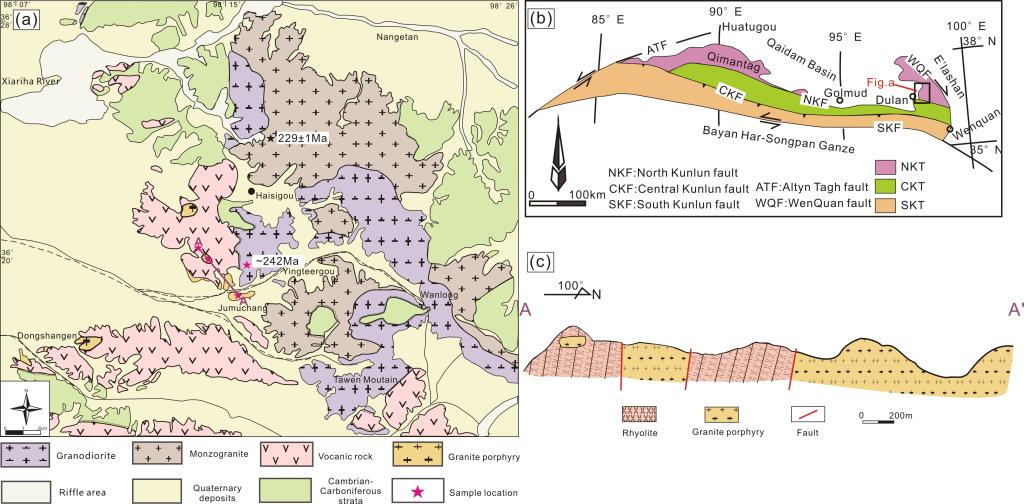 图1研究区地质简图(a);东昆仑造山带大地构造图(b);都兰火山-侵入岩地质剖面图(c)