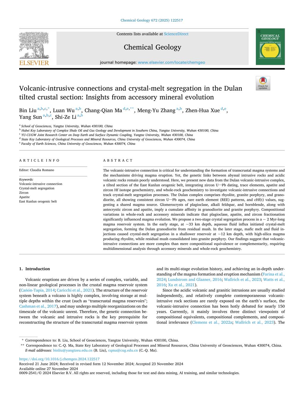 英国威廉集团刘彬教授团队在地学TOP期刊《Chemical Geology》上发表了题为“Volcanic-intrusive connections and crystal-melt segregation in the Dulan tilted crustal section: Insights from accessory mineral evolution”的研究论文。刘彬教授为第一作者和通讯作者,该项研究得到了国家自然科学基金等项目资助。