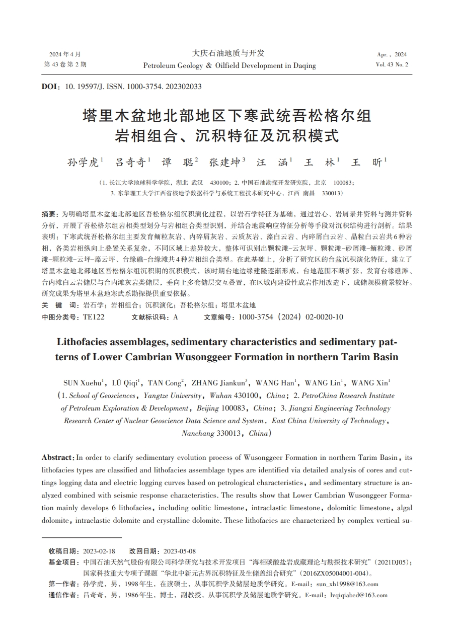 我院硕士生孙学虎在《大庆石油地质与开发》上发表了题为“塔里木盆地北部地区下寒武统吾松格尔组岩相组合、沉积特征及沉积模式”的研究论文,采用岩相学、沉积学的方法,分析了塔北地区下寒武统吾松格尔组沉积特征演化过程。威廉williamhill为论文第一署名单位,孙学虎为第一作者,导师吕奇奇副教授为通讯作者。
