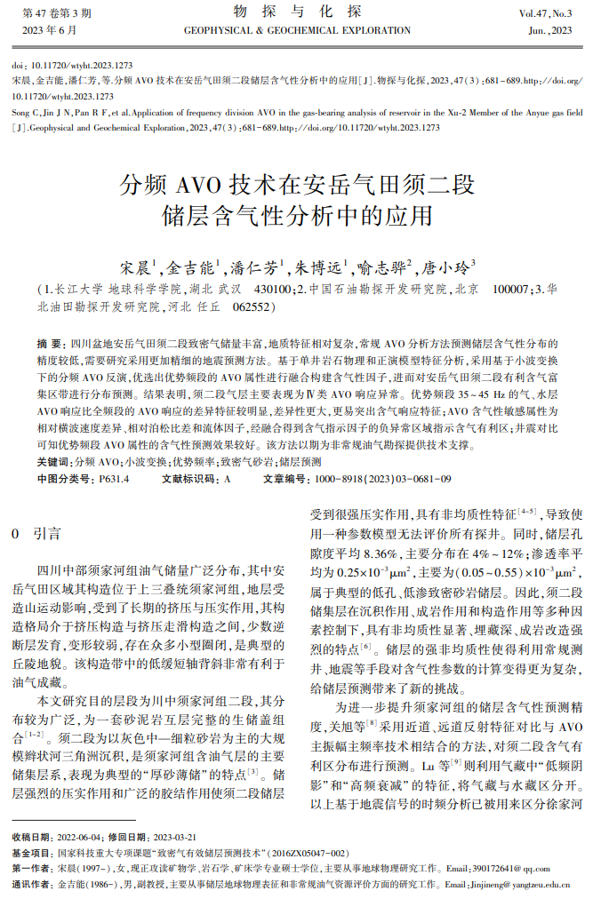 地科学院硕士生宋晨在地球物理领域期刊《物探与化探》期刊发表题为“分频AVO技术在安岳气田须二段储层含气性分析中的应用”的研究论文。英国威廉集团为论文第一署名单位,硕士生宋晨为论文第一作者,金吉能副教授为通讯作者。
