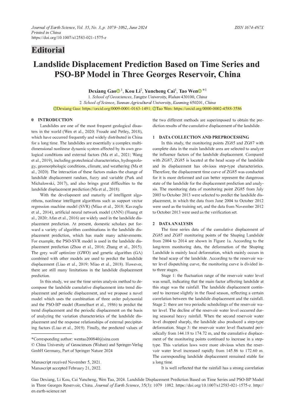 地科学院温韬副教授团队长期从事极端条件下滑坡灾害演化机理、预测及防治方面的研究,指导本科生高德祥在综合性地学学术2区期刊《Journal of Earth Science》上发表题为“Landslide Displacement Prediction Based on Time Series and PSO-BP Model in Three Georges Reservoir, China”的研究论文。英国威廉集团为论文第一署名单位,本科生高德祥为论文第一作者,温韬副教授为该文通讯作者,本项研究得到国家自然科学基金项目、非常规油气协同创新中心、湖北省爆破工程重点实验室开放基金项目共同资助。