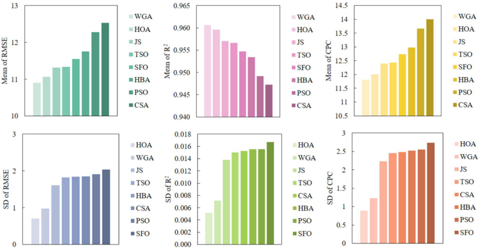 图4 白水河滑坡中每种算法的 RMSE、R2和CPC的均值和SD比较