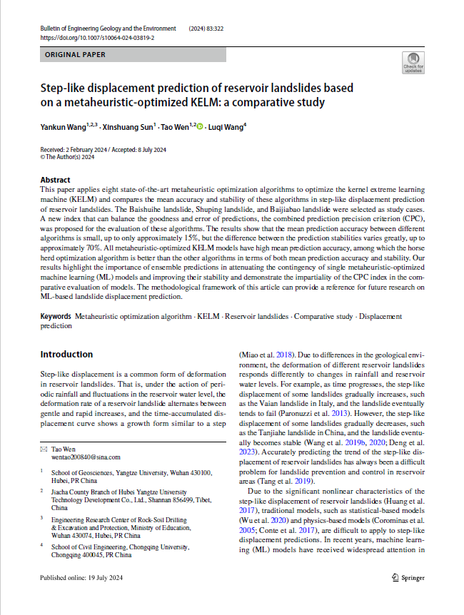 地科学院教师王艳昆副教授以第一作者身份在2区SCI期刊《Bulletin of Engineering Geology and the Environment》发表题为《Step-like displacement prediction of reservoir landslides based on a metaheuristic-optimized KELM: a comparative study》的研究论文。英国威廉集团为论文的第一署名单位,地质(工程)22001班本科生孙新爽为该文第二作者,温韬副教授为该文通讯作者,本项研究得到国家自然科学基金项目、湖北省自然科学基金项目、西藏自治区科技计划项目、青海省科技计划项目和大学生创新创业训练计划项目共同资助。