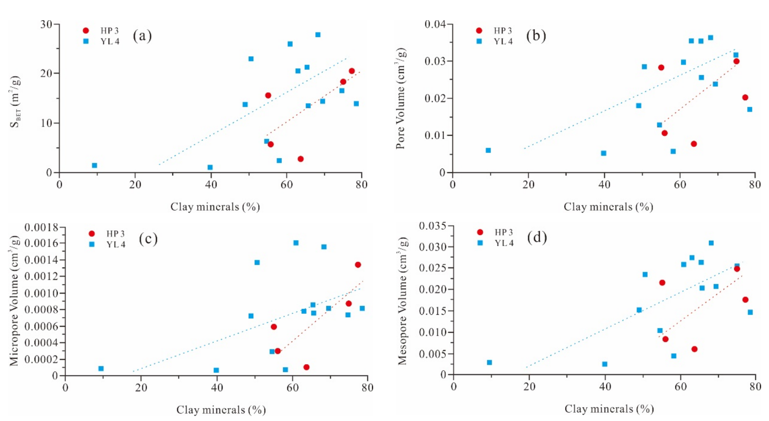 图1.黏土矿物含量和孔隙结构特征相关性