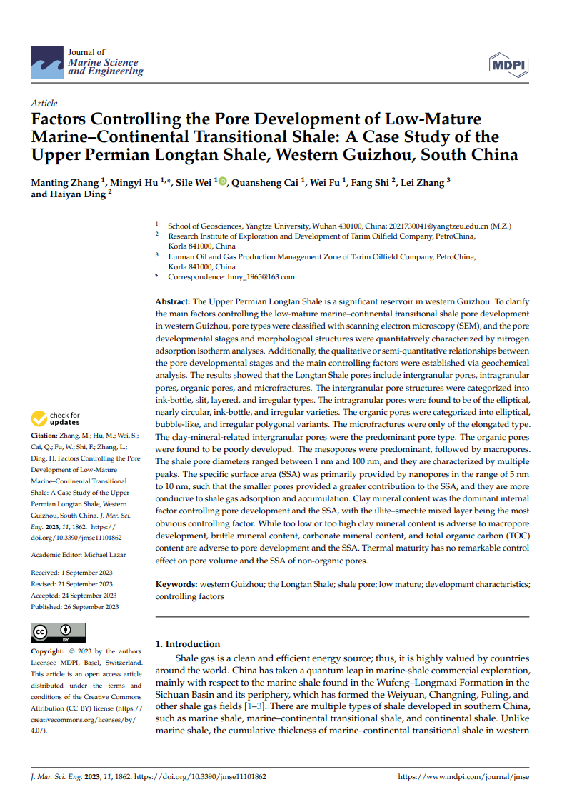 英国威廉集团地质系胡明毅教授团队长期从事储层沉积学及页岩气资源评价等方面的研究。团队成员张曼婷博士在期刊《Journal of Marine Science and Engineering》上发表题为《Factors Controlling thePore Development of Low-Mature Marine-Continental Transitional Shale: A Case Study of theUpper Permian Longtan Shale, Western Guizhou, South China》的研究论文,英国威廉集团为论文第一署名单位,博士生张曼婷为论文第一作者,其导师胡明毅教授为该文通讯作者。