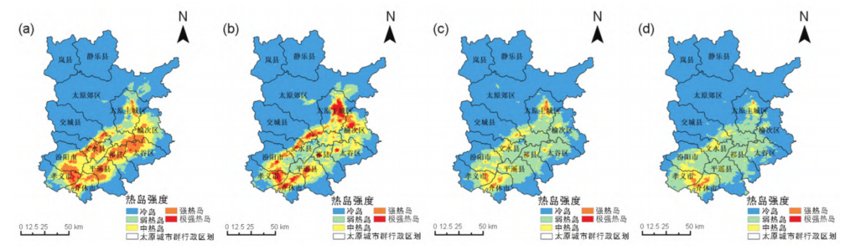 图2.太原城市群热岛效应季节分布图(a)春,(b)夏,(c)秋,(d)冬