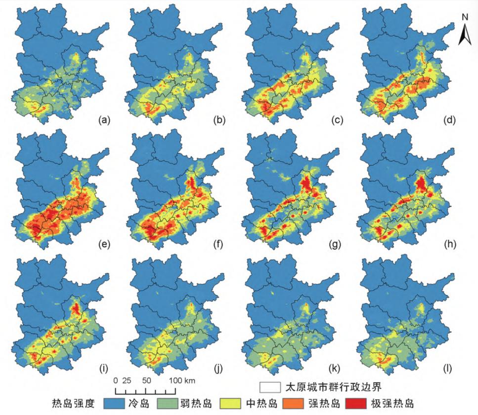 图1.太原城市群热岛月份分布图((a)—(l):1月—12月)