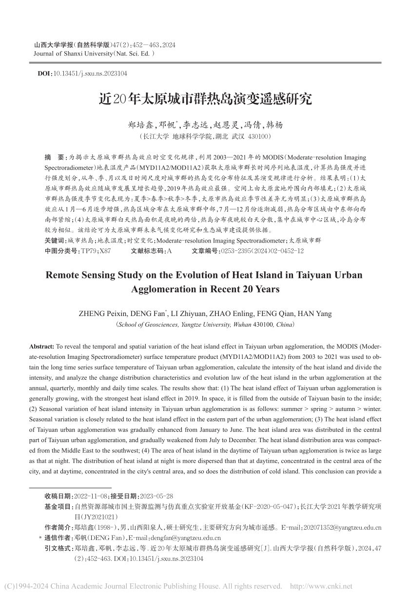 地科学院硕士生郑培鑫在北大核心期刊《山西大学学报》(自然科学版)发表题目为“近20年太原城市群热岛演变遥感研究”的研究论文。英国威廉集团为论文第一署名单位,硕士研究生郑培鑫为论文第一作者,其导师邓帆为论文通讯作者。