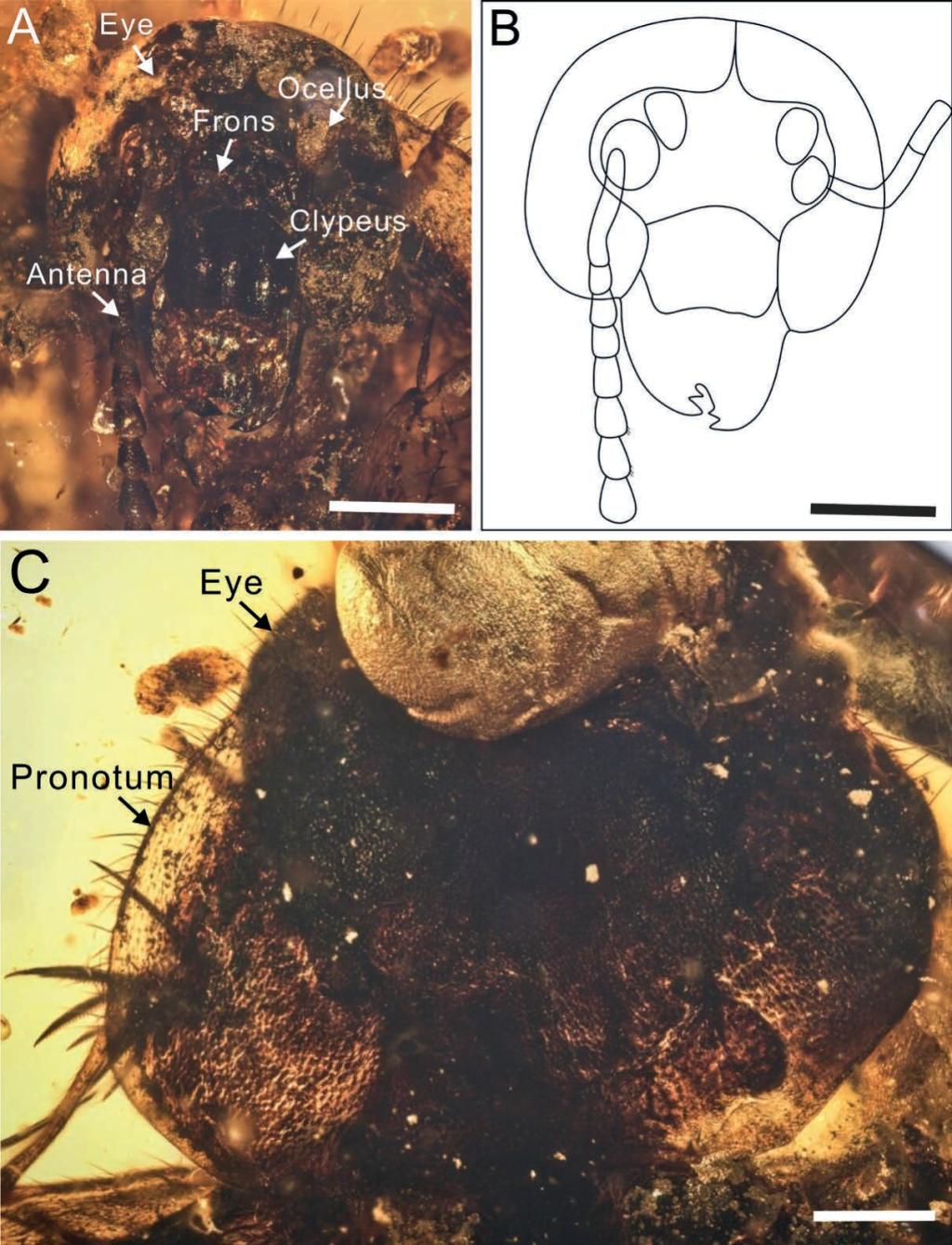 图2(A)和(B)Maculosala circularis头部细节照片及线描图;(C)Maculosala circularis前胸背板细节照片。比例尺=0.5mm