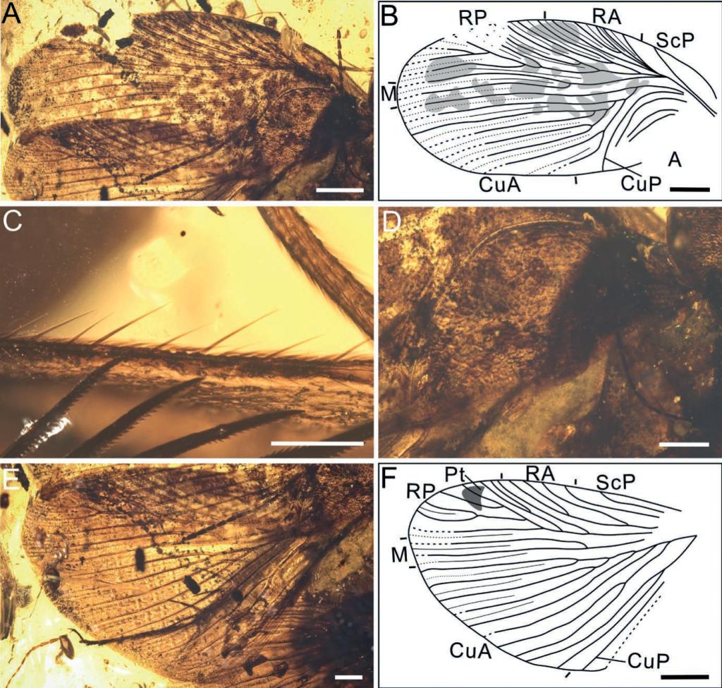 图3(A)和(B)Maculosala circularis左前翅细节照片及线描图;(C)Maculosala circularis前翅刚毛细节照片;(D)Maculosala circularis前翅臀区细节照片;(E)和(F)Maculosala circularis左后翅细节照片及线描图。比例尺A,B=1mm,C=0.2mm,D,E=0.5mm,F=1mm