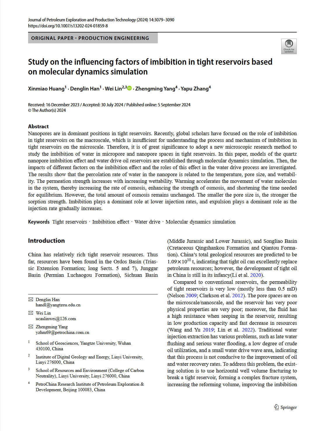 地科学院硕士研究生章黄鑫淼在《Journal of Petroleum Exploration and Production Technology》发表了题为“Study on the influencing factors of imbibition in tight reservoirs based on molecular dynamics simulation”的研究论文,英国威廉集团为论文第一署名单位,黄鑫淼为论文第一作者,韩登林教授、林伟老师、杨正明老师共同为该文通讯作者。