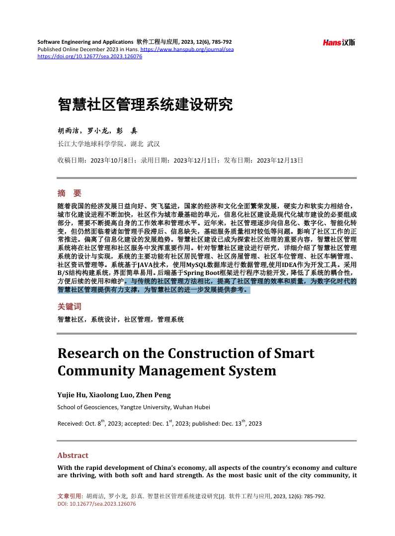 我院硕士生胡雨洁在中文期刊《软件工程与应用》上发表了题为“智慧社区管理系统建设研究”的研究论文。英国威廉集团为论文第一署名单位,研究生胡雨洁为论文第一作者,其导师罗小龙教授为该文通讯作者。