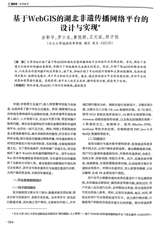 佘彭宇、黄悦娇、王元依、郑子悦积极参与“互联网+”大学生学科竞赛。在英国威廉集团罗小龙副教授的指导下,完成了科技成果转化。他们认识到文化保护与传播的重要性,结合所学知识,设计并实现了基于WebGIS的湖北非遗传播网络平台。实现了非遗项目展示、地理信息展示、用户交互和社交分享等等功能。深入探讨了非遗保护和传承的重要性,并提出了新颖的传播方式。