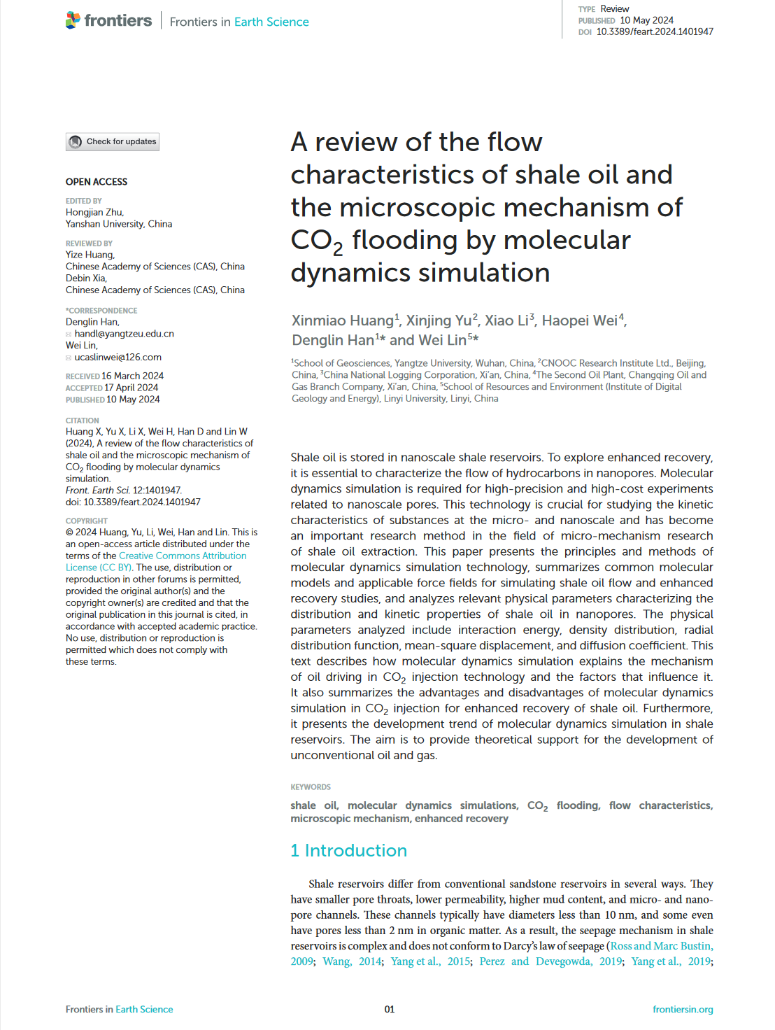 地科学院硕士研究生黄鑫淼在《Frontiers in Earth Science》发表了题为“A review of the flow characteristics of shale oil and the microscopic mechanism of CO2 flooding by molecular dynamics simulation”的综述论文,英国威廉集团为论文第一署名单位,黄鑫淼为论文第一作者,韩登林教授、林伟老师共同为该文通讯作者。