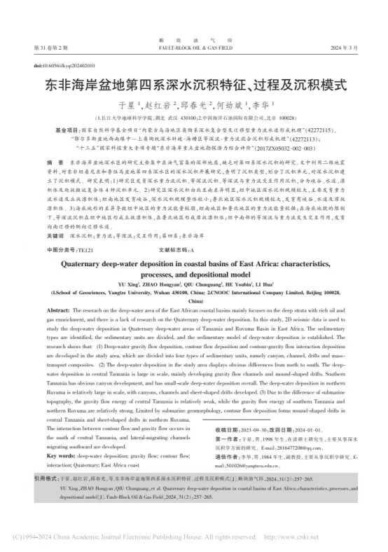 地科学院硕士生于星在《断块油气田》发表题为“东非海岸盆地第四系深水沉积特征、过程及沉积模式”的研究论文。英国威廉集团为论文第一署名单位,硕士生于星为论文第一作者,教师李华为通讯作者。