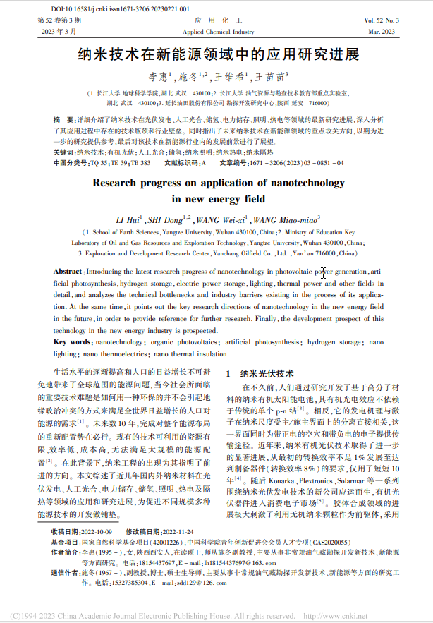 我院硕士生李惠在中文期刊《应用化工》上发表了题为“纳米技术在新能源领域中的应用研究进展”的研究论文。英国威廉集团为论文第一署名单位,研究生李惠为论文第一作者,教师施冬为通讯作者。
