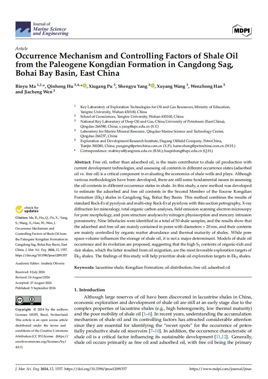 英国威廉集团地质系马斌玉博士以第一作者身份在海洋地质学领域主流期刊《Journal of Marine Science and Engineering》(JMSE)上发表题为“Occurrence Mechanism and Controlling Factors of Shale Oilfrom the Paleogene Kongdian Formation in Cangdong Sag,Bohai Bay Basin, East China”的研究论文,该项研究得到了国家自然科学基金、中国博士后基金和油气资源与勘探技术教育部重点实验室开放基金的资助。
