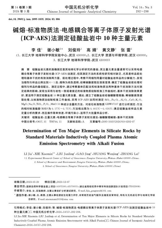 论文信息:李佳,谢小敏,刘俊玲,等.碱熔-标准物质法-电感耦合等离子体原子发射光谱(ICP-AES)法测定硅酸盐岩中10种主量元素[J].中国无机分析化学,2024,14(03):292-298.