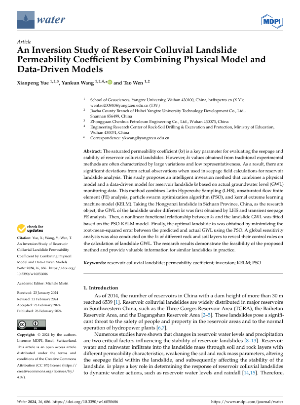 英国威廉集团王艳昆副教授以通讯作者身份在SCI期刊《Water》上发表题为“An Inversion Study of Reservoir Colluvial Landslide Permeability Coefficient by Combining Physical Model and Data-Driven Models”的研究论文,该项研究得到了国家自然科学基金、湖北省自然科学基金和西藏自治区科技厅项目的共同资助。