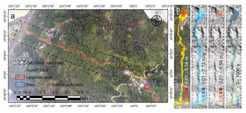 图2 链式灾害事件过程的多相流模拟结果(a. 模拟区域及对象设置;b. 灾害事件期间的最大多相流高度;c. 灾害事件期间的最大多相流速;d. 泥沙源裹挟深度;e. 不同时间节点的到达范围图)
